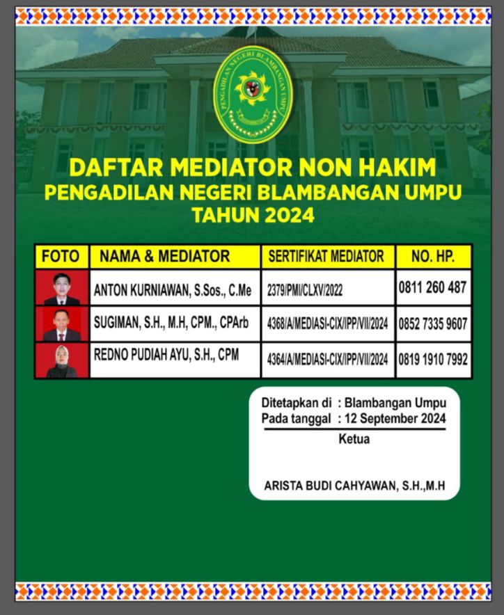 Keduanya telah berhasil diterima sebagai Mediator Non Hakim di Pengadilan Negeri Blambangan Umpu tahun 2024. Prestasi ini merupakan pencapaian yang luar biasa dan menjadi bukti nyata kompetensi serta dedikasi mereka dalam bidang mediasi. Semoga mereka terus berkontribusi dalam penyelesaian sengketa dan memberikan pelayanan terbaik di ranah hukum.