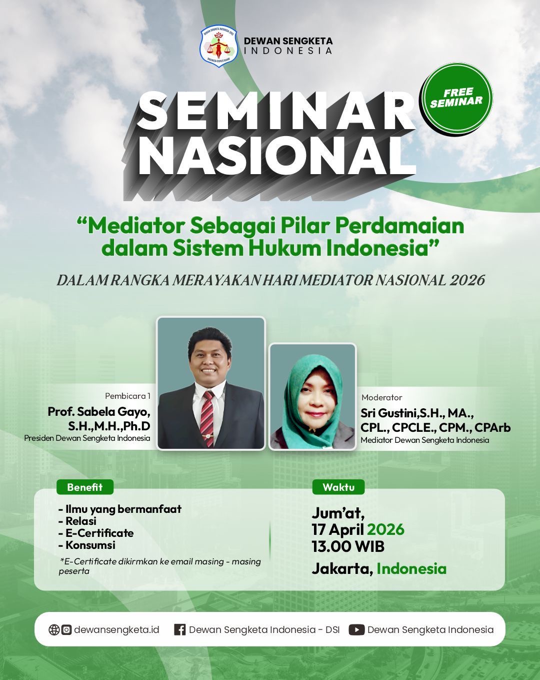Jakarta, 17 April 2026 — Dalam rangka merayakan Hari Mediator Nasional 2026, Dewan Sengketa Indonesia (DSI) menyelenggarakan Seminar Nasional bertema “Mediator Sebagai Pilar Perdamaian dalam Sistem Hukum Indonesia.” Kegiatan ini bertujuan menegaskan kembali peran strategis mediator dalam menciptakan penyelesaian sengketa yang damai, efektif, dan berkeadilan di Indonesia.