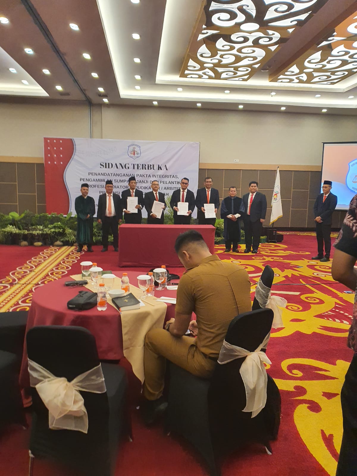 Dalam sidang terbuka ini, peserta tidak hanya mengucapkan sumpah atau janji profesi, tetapi juga menandatangani Pakta Integritas sebagai bentuk komitmen untuk menjalankan tugas dengan penuh tanggung jawab dan integritas. Pengambilan sumpah/janji ini merupakan salah satu syarat penting bagi para mediator dan arbiter sebelum resmi menjalankan tugas mereka dalam menangani sengketa di masyarakat.