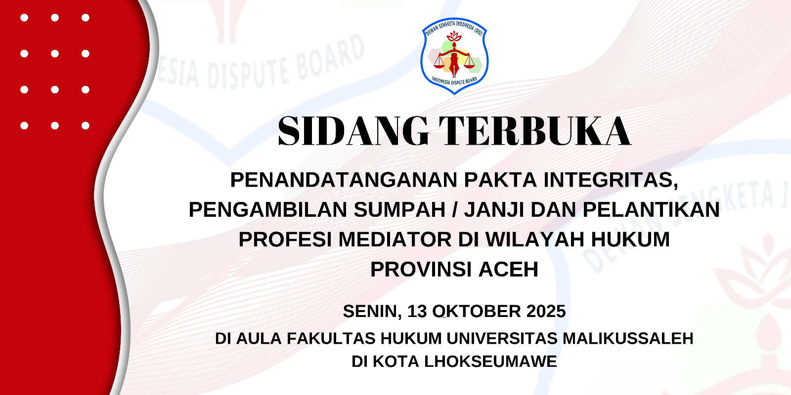 Aceh, 13 Oktober 2025 β Dewan Sengketa Indonesia akan menggelar Sidang Terbuka dalam rangka Penandatanganan Pakta Integritas, Pengambilan Sumpah, dan Pelantikan Profesi Mediator, Ajudikator, Konsiliator, Arbiter, serta Praktisi Dewan Sengketa di wilayah hukum Provinsi Aceh.