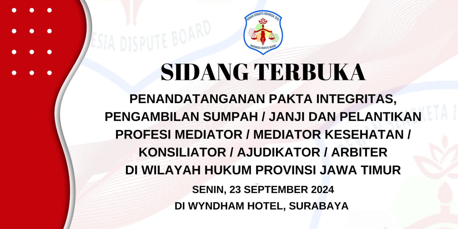 Pada hari Senin, 23 September 2024, akan diselenggarakan Sidang Terbuka yang krusial di Wilayah Hukum Provinsi Jawa Timur. Acara ini akan meliputi Penandatanganan Pakta Integritas, Pengambilan Sumpah, dan Pelantikan bagi para profesional di bidang penyelesaian sengketa, yaitu Profesi Mediator, Ajudikator, Konsiliator, Arbiter, dan Praktisi Dewan Sengketa. Acara prestisius ini akan berlangsung di Wyndham Hotel, Surabaya.