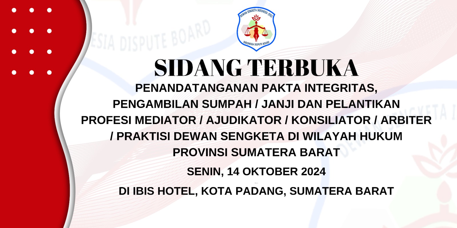 Pada hari Senin, 14 Oktober 2024, akan diadakan Sidang Terbuka yang sangat penting dan bersejarah di Wilayah Hukum Provinsi Sumatera Barat. Acara ini akan menggelar Penandatanganan Pakta Integritas, Pengambilan Sumpah, serta Pelantikan bagi para profesional di bidang hukum, yaitu Profesi Mediator, Ajudikator, Konsiliator, Arbiter, dan Praktisi Dewan Sengketa. Acara ini akan berlangsung di Ibis Hotel, Kota Padang, Sumatera Barat.