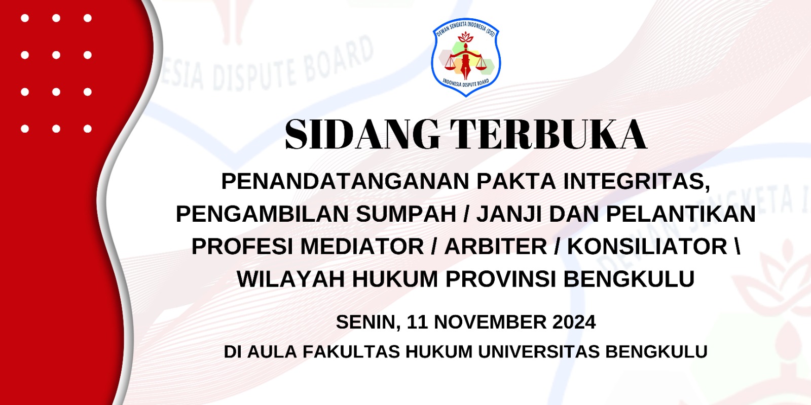 SIDANG TERBUKA: Penandatanganan Pakta Integritas, Pengambilan Sumpah dan Pelantikan Profesi Mediator / Ajudikator / Konsiliator / Arbiter / Praktisi Dewan Sengketa di Wilayah Hukum Provinsi Bengkulu