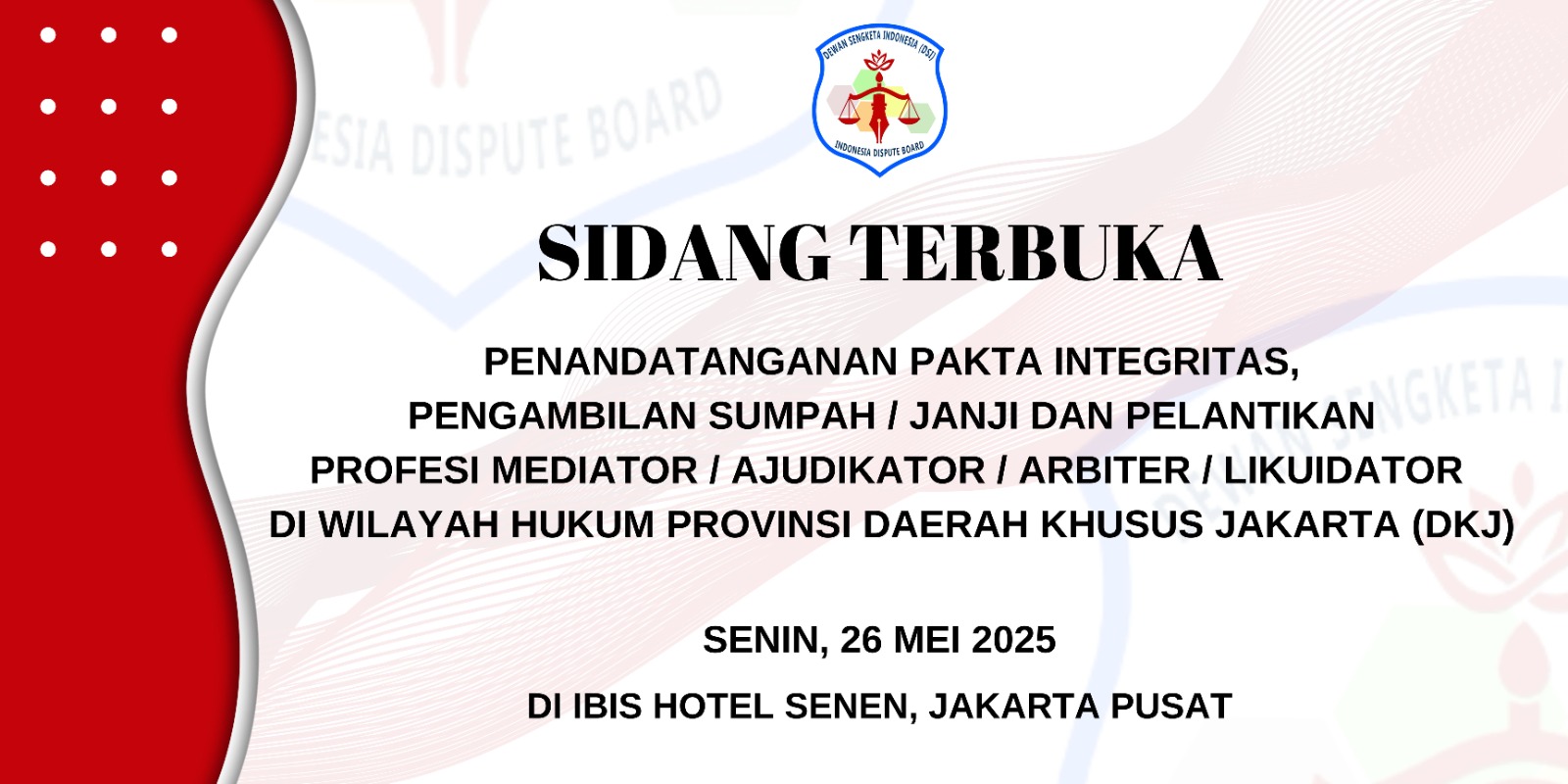 Jakarta, Indonesia – Pada Senin, 26 Mei 2025, Dewan Sengketa Indonesia (DSI) akan menyelenggarakan Sidang Terbuka di Ibis Hotel Senen, Jakarta Pusat, yang mencakup Penandatanganan Pakta Integritas, Pengambilan Sumpah serta Pelantikan Profesi Mediator, Ajudikator, Konsiliator, Arbiter, dan Praktisi Dewan Sengketa yang berada di wilayah hukum Provinsi Daerah Khusus Jakarta (DKJ).