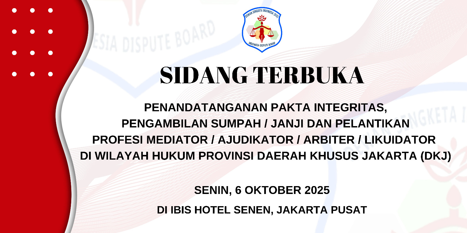 Jakarta — Senin, 6 Oktober 2025, akan diselenggarakan Sidang Terbuka dalam rangka Penandatanganan Pakta Integritas, Pengambilan Sumpah, dan Pelantikan Profesi Mediator, Ajudikator, Konsiliator, Arbiter, serta Praktisi Dewan Sengketa. Acara ini akan berlangsung di Ibis Hotel Senen, Jakarta Pusat, khusus untuk wilayah hukum Provinsi Daerah Khusus Jakarta (DKJ).