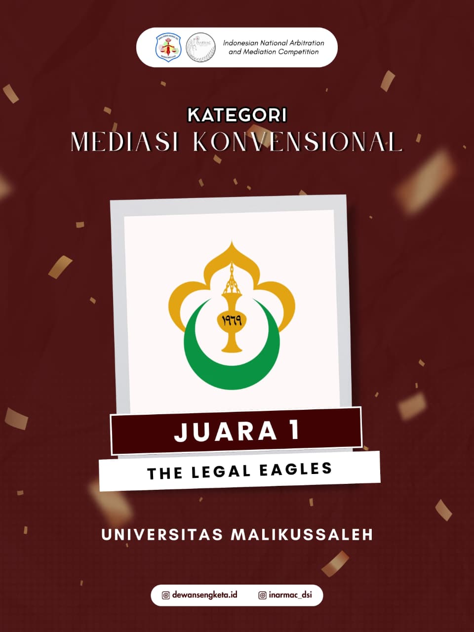 Prestasi membanggakan berhasil diraih oleh The Legal Eagles dari Universitas Malikussaleh dalam ajang Indonesian National Arbitration and Mediation Competition (INARMAC). Tim ini sukses meraih Juara 1 Kategori Mediasi Konvensional, mengungguli tim-tim kuat dari berbagai perguruan tinggi di Indonesia.