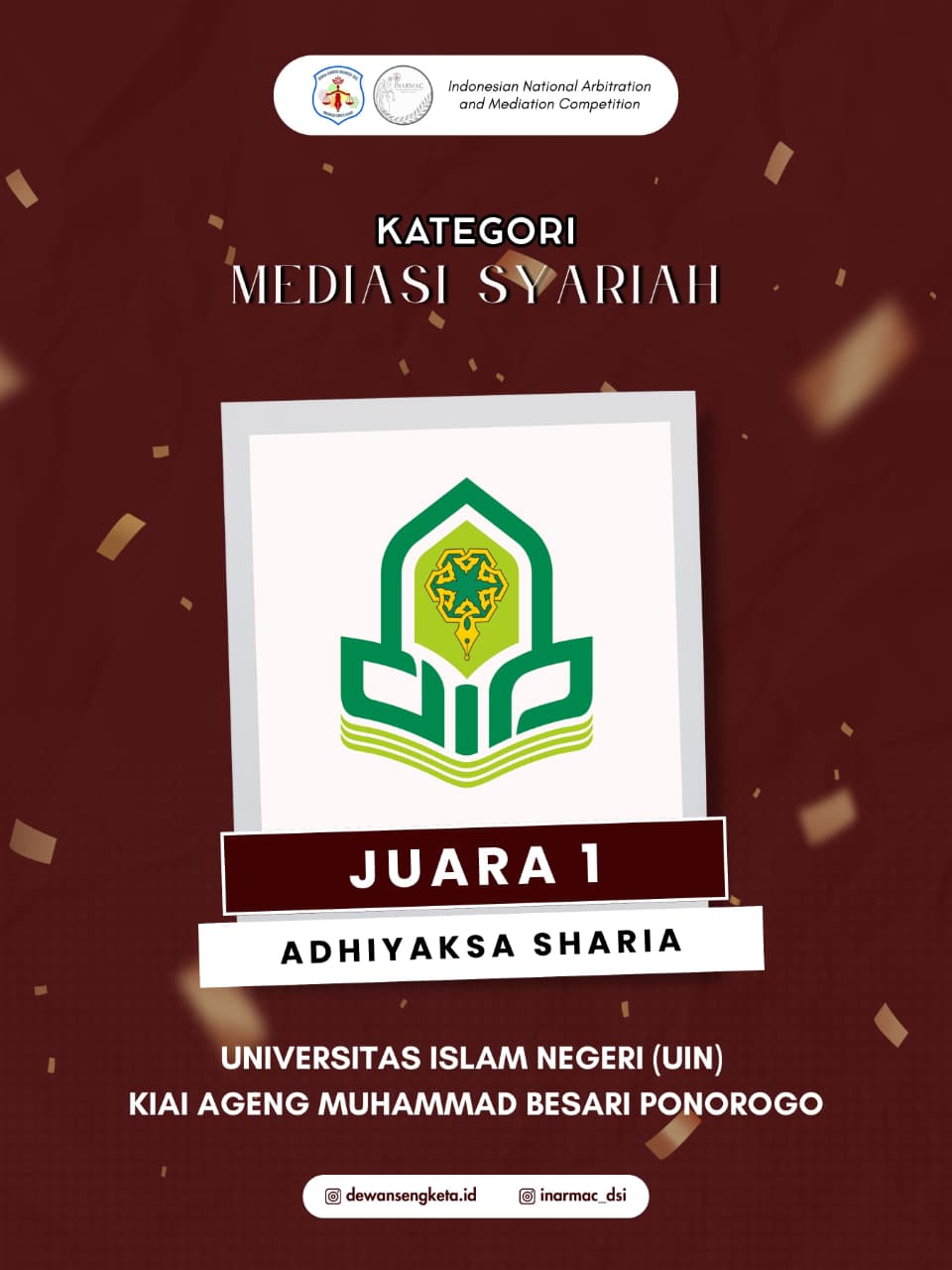 Prestasi membanggakan kembali ditorehkan oleh mahasiswa Universitas Islam Negeri (UIN) Kiai Ageng Muhammad Besari Ponorogo. Tim Adhiyaksa Sharia berhasil meraih Juara 1 Kategori Mediasi Syariah dalam ajang Indonesian National Arbitration and Mediation Competition (INARMAC).