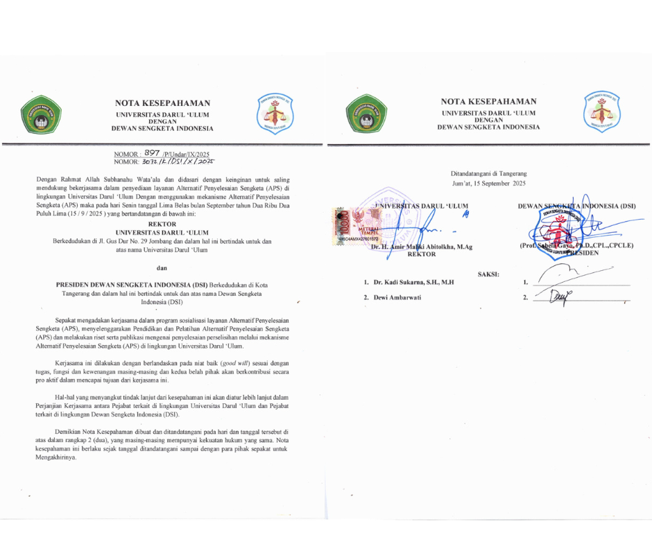 Dengan adanya kesepahaman ini, Universitas Darul ‘Ulum dan DSI berkomitmen untuk bersama-sama memperkuat peran lembaga pendidikan dalam membangun budaya penyelesaian sengketa secara alternatif yang lebih efektif, adil, dan berkeadaban.