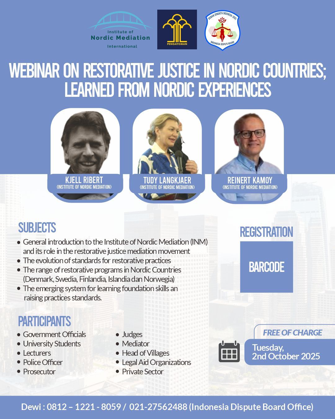 Indonesia Dispute Board Office akan menyelenggarakan Webinar bertajuk “Restorative Justice in Nordic Countries; Learned from Nordic Experiences” pada Selasa, 2 Oktober 2025.